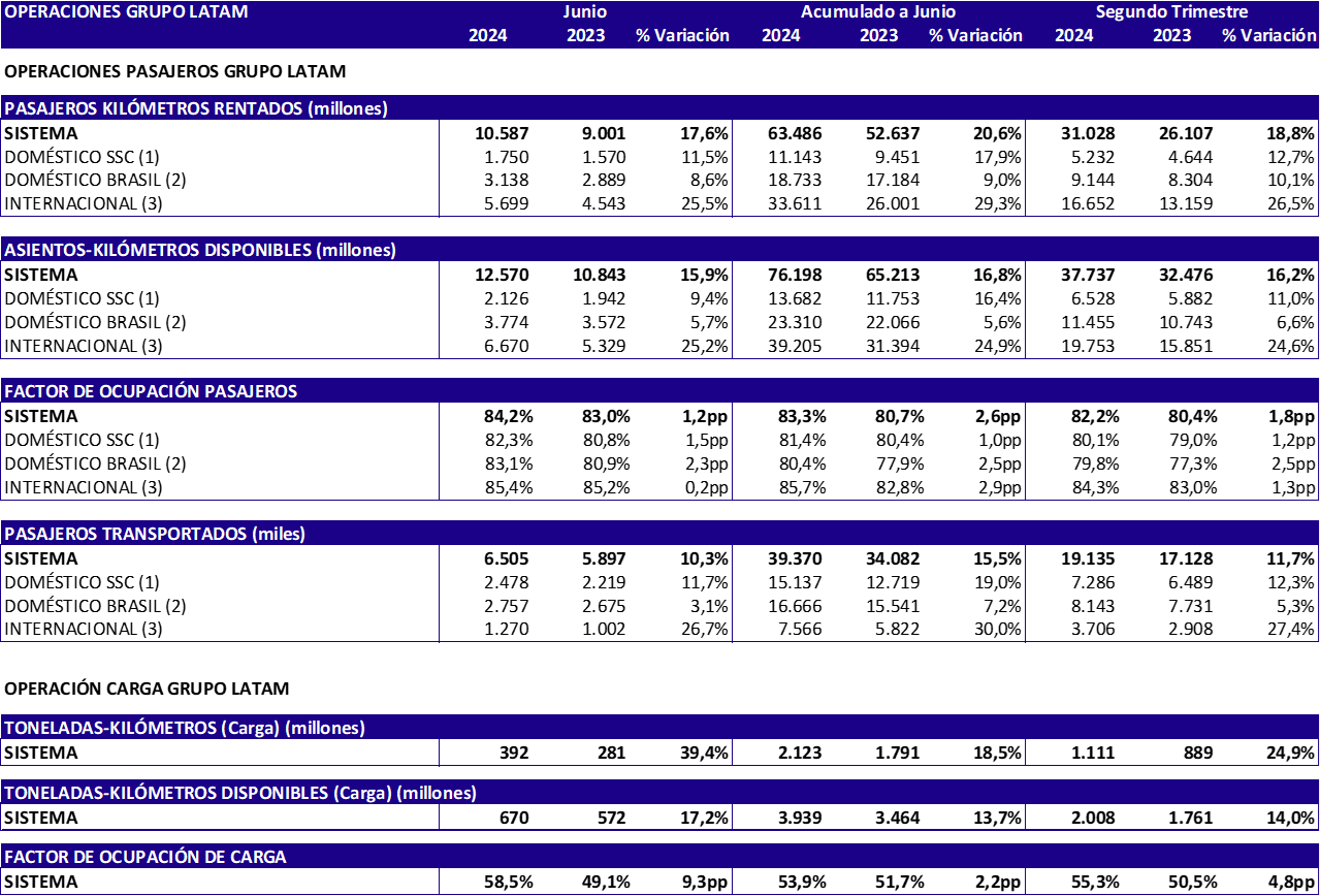 La siguiente tabla resume las principales estadísticas operacionales para el mes, trimestre y año acumulado a junio del grupo LATAM: