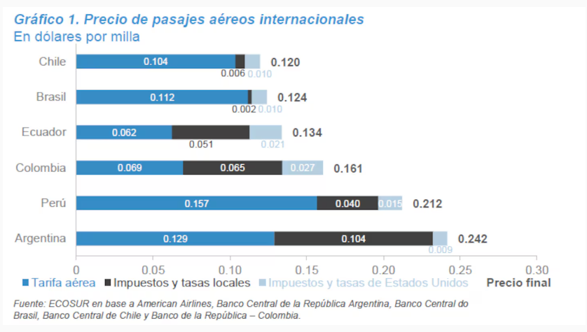 Los datos surgen de un informe de la fundación Ecosur, de la Bolsa de Comercio de Córdoba en conjunto con la consultora MindY-Economics. Según el trabajo, un vuelo desde la Argentina al exterior puede salir el doble que desde Chile o Brasil. Esto se debe a que se pagan más en impuestos y tasas que por la tarifa aérea que cobra la aerolínea.