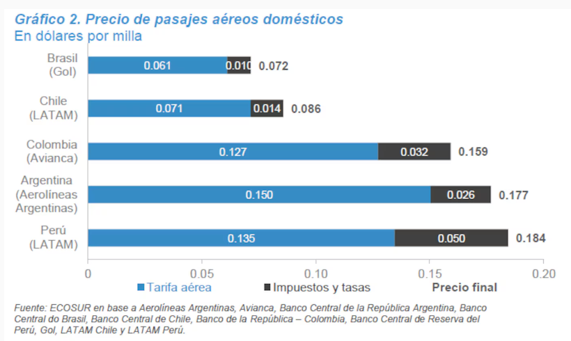 “El peso de los impuestos y tasas locales es de 0,104 dólares por milla para los argentinos, más del doble que en Perú y Ecuador (0,040 y 0,051 dólares por milla respectivamente)”, remarca el informe.