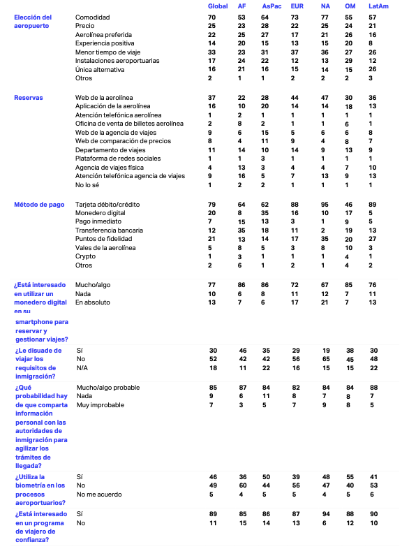 Los pasajeros de América Latina y el Caribe prefieren reservar sus viajes con tarjeta de crédito o débito. Son los que más valoran la flexibilidad de pago, prefiriendo pagar a plazos más que cualquier otra región. Se inclinan más que cualquier otra región por obtener visados en un consulado o embajada. Utilizan la biometría con menos frecuencia que otras regiones; sin embargo, se muestran muy dispuestos a adoptar la tecnología y manifiestan una gran satisfacción cuando lo hacen.