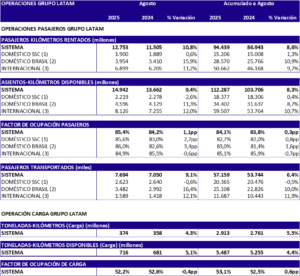 El grupo Latam Airlines confirmó que en agosto pasado movilizó 7,7 millones de pasajeros, con un incremento anual de 9,1% en comparación con agosto del año pasado. En ese contexto, la compañía dijo que incrementó su capacidad consolidada, medida en asientos-kilómetros disponibles (ASK), en 9,4% respecto al mismo mes de 2024. El tráfico consolidado, medido en pasajeros-kilómetros rentados (RPK), aumentó 10,8%. Como resultado, el factor de ocupación consolidado alcanzó 85,4%, lo que representa un alza de 1,1 puntos porcentuales en comparación con el mismo mes del año anterior. El crecimiento fue impulsado, principalmente, por un incremento de 12% en la oferta internacional del grupo, junto con un alza de 11,3% en la oferta doméstica de Latam Airlines Brasil. En el acumulado del año, el grupo ha transportado un total de 57,1 millones de pasajeros entre enero y agosto de 2025. En Colombia, según las cifras de la Aeronáutica Civil, con corte a julio, la aerolínea transportó 892.134 pasajeros en el séptimo mes, lo que se tradujo en una ligera disminución de 0,9% frente al mismo mes de 2024.
