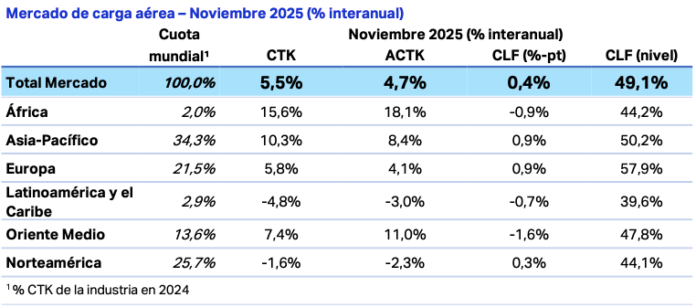 “La demanda del transporte aéreo de carga creció un 5,5% interanual en noviembre de 2025, impulsada por el interés en la puntualidad de las entregas por parte de los transportistas ante la proximidad de la temporada navideña. La fuerte demanda en los mercados emergentes y el crecimiento selectivo en Oriente Medio compensaron con creces la desaceleración en las Américas, provocada por el ajuste al nuevo régimen arancelario de Estados Unidos. En general, el cuarto trimestre fue positivo para el transporte aéreo de carga, gracias al reajuste estratégico de las rutas comerciales, que determinó el rendimiento en los principales mercados. Este buen desempeño a finales de 2025 es un buen augurio para el sector del transporte aéreo de carga de cara al nuevo año.