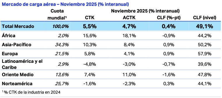 La Asociación de Transporte Aéreo Internacional publicó los resultados de los mercados mundiales de carga aérea correspondientes a noviembre de 2025, entre los que destacan los siguientes resultados: