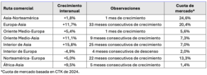 - La demanda global —medida en toneladas de carga por kilómetro transportadas (CTK, por sus siglas en inglés)— creció un 5,5% interanual (+6,9% en las operaciones internacionales).