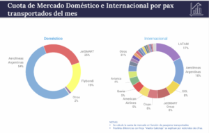 En el mercado doméstico, diciembre, según datos suministrados por la ANAC, muestra números de participación casi similares a los de los últimos meses, con Aerolíneas Argentinas y Flybondi perdiendo mercado respecto al mismo mes del año pasado, y JetSmart incrementando su participación producto de un aumento significativo en la oferta en los primeros meses del año.