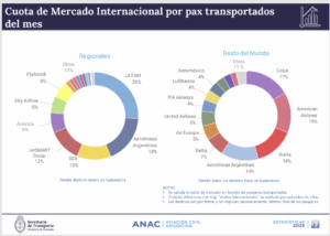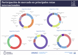 En las rutas más destacadas, como Argentina-Brasil, Gol dominó la misma con el 25% del tráfico, seguida por Aerolíneas Argentinas 21%, Latam 17%, JetSmart 13% y Flybondi 11%, en tanto que en la ruta Argentina-Chile, el 42% lo absorbió Latam, Sky el 21%, JetSmart 17% y Aerolíneas Argentinas el 10%. En la ruta Argentina-España el líder indiscutido fue Iberia con el 61% del tráfico, seguida por Air Europa con el 23% y Aerolíneas Argentinas con el 16%. En Argentina–Estados Unidos fue American Airlines quien lideró con el 43%, delante de Delta 21%, United 16%, Aerolíneas Argentinas 14% y Latam 6%, y en la ruta Argentina-Perú, quien la encabezó fue Latam, que transportó el 73% de los pasajeros de esa ruta, seguida, lejos, por Sky y JetSmart con el 9% y Aerolíneas Argentinas 8%.